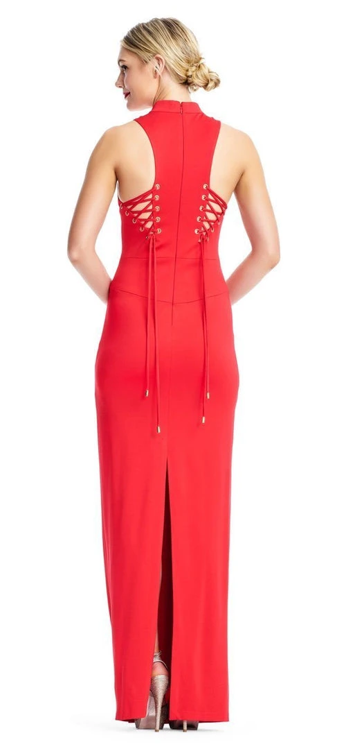 Gift yourself with beauty in this sophisticated stunner by Adrianna Papell AP1E202675. A high halter neckline crowns the sleeveless bodice adorned with tailoring seams which ensures the flattering fit. A front cutout detail adds allure to this stunner as it flaunts one of your best assets, your cleavage. This gown tapers to a full length hem with a full back secured with a center zipper and corset closure. Walk the red carpet in style with this sexy gown by Adrianna Papell.