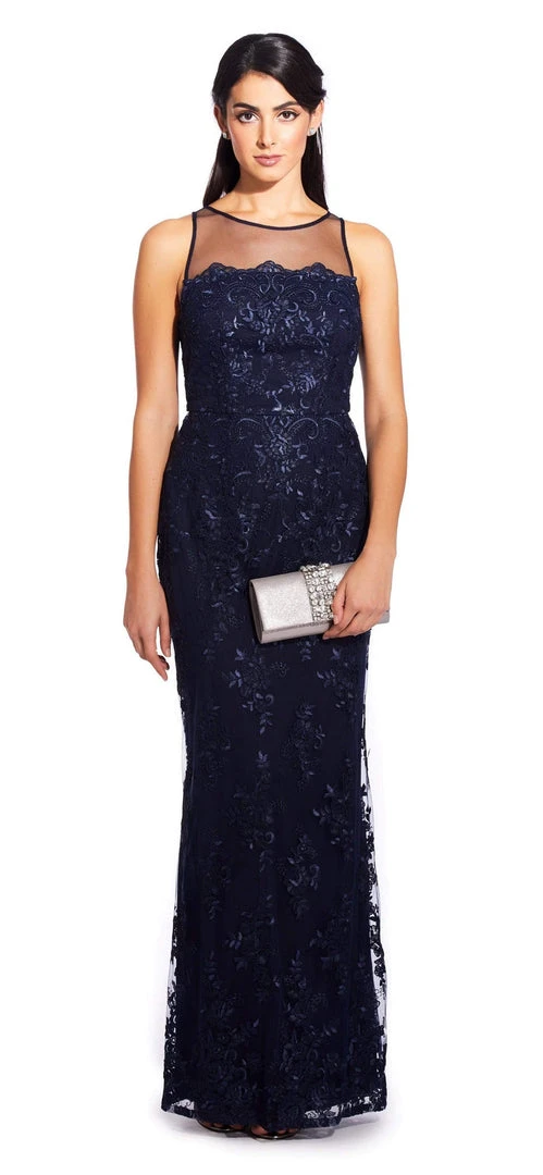 Look your absolute best in this classy creation by Adrianna Papell AP1E204699. This stunning long evening dress showcases an illusion bateau neckline which lends an ultra-sophisticated touch to this floor-sweeping formal dress, prettily offsetting the ornate floral embroidery and corded detailing. Scalloped lace details trim the neckline for a striking look. This evening dress is fully lined for a smooth fit, while a deep back slit that adds yet more glamour and ensures ease of movement. Envision the ideal evening in this Adrianna Papell ensemble.