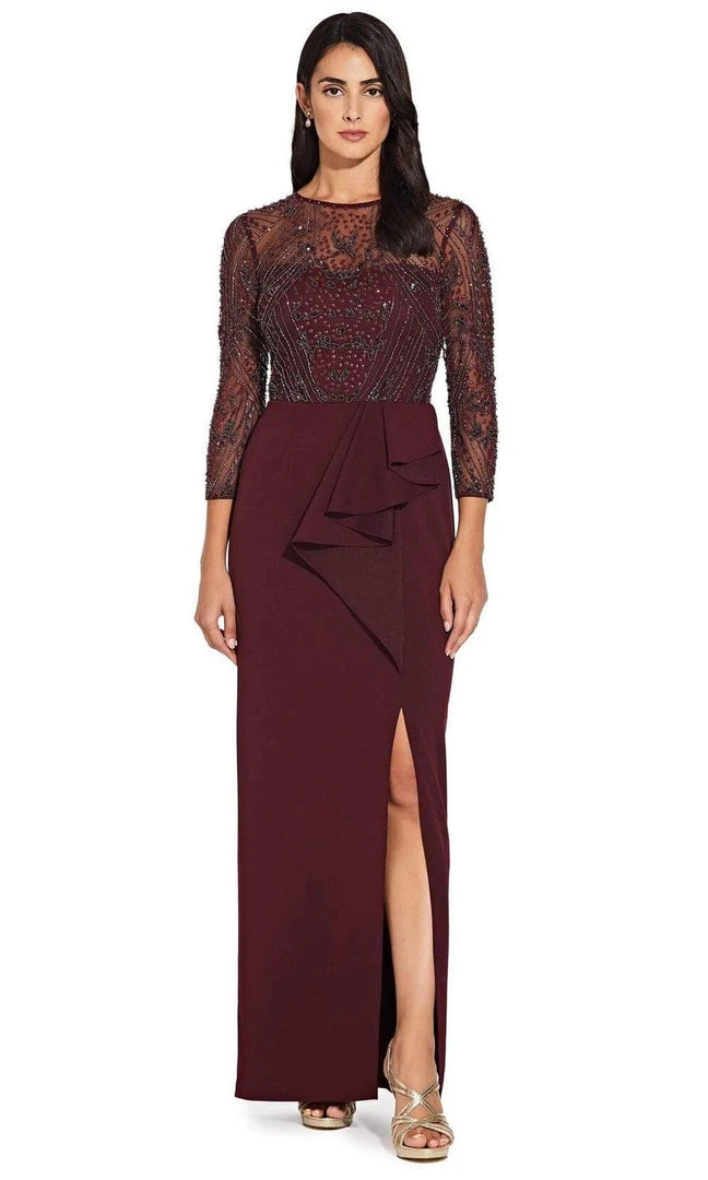Look fantastic for your next formal event in this dress by Adrianna Papell AP1E205600. Fashions in jewel neckline with quarter sleeves, this gorgeous dress is adorned with beads. This floor length dress is accented with a ruffle detail and complemented with a side slit. Experience the outstanding effect in this creation by Adrianna Papell.