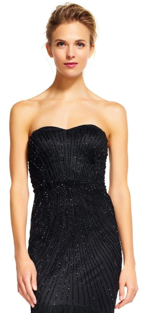 Classic glamour and a touch of sparkle are only two of the stunning details on this mermaid gown by Adrianna Papell AP1E200879. This strapless gown features a sweetheart neckline, a beaded extended bodice with drop waist, and a flared tulle trumpet skirt. This Adrianna Papell gown is a perfect 10 when paired with sparkling high heels and a contrasting clutch.