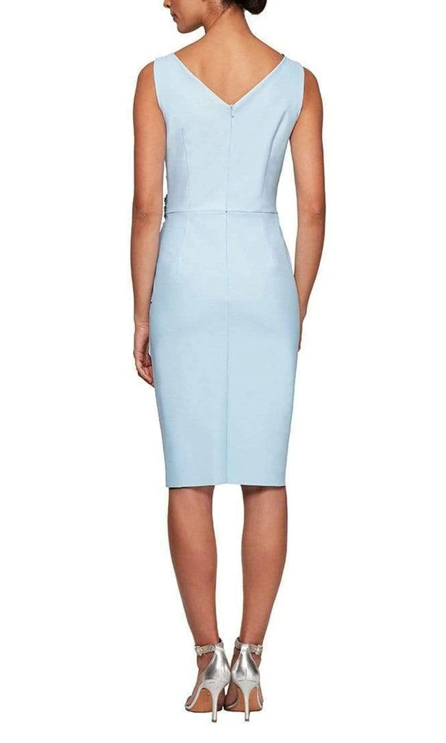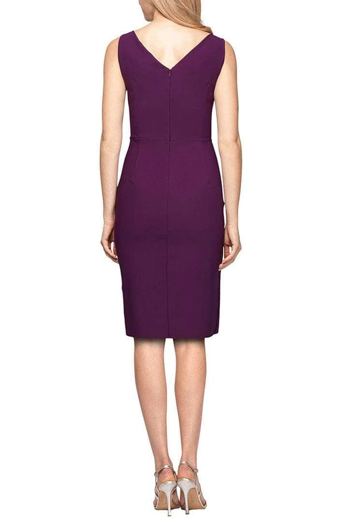 Make an extraordinary statement when you walk in this elegant cocktail dress by Alex Evenings 134005. The solid-toned scuba tank dress fashions a V neckline that leads the surplice bodice, with draped waist, beaded detail side accent, and wraps style sheath silhouette skirt. The v-shaped back has an invisible center zipper and a visible sculpting seam giving the dress that comfortable stylish fit. Flaunt your figure in this fabulous Alex Evenings design.