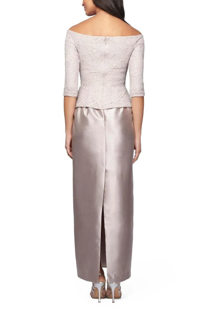 Elegant and alluring, this classy formal dress from Alex Evenings 2121259 is ready to shine at your next special event. This special occasion gown features a floral lace bodice with an off-the-shoulder embroidered neckline, quarter-length sleeves, and a mid-open back. Its Mikado satin skirt features a full-length hem that ends just above your feet with a knee-high central slit at the back. A perfect outfit as guest on a wedding or at a formal party, this Alex Evenings dress will sure to add sophistication. Everything about the Alex Evenings dresses is perfect whether you talk about the texture, cuts, fitting, design, fabric, or price. Model is wearing Taupe color.