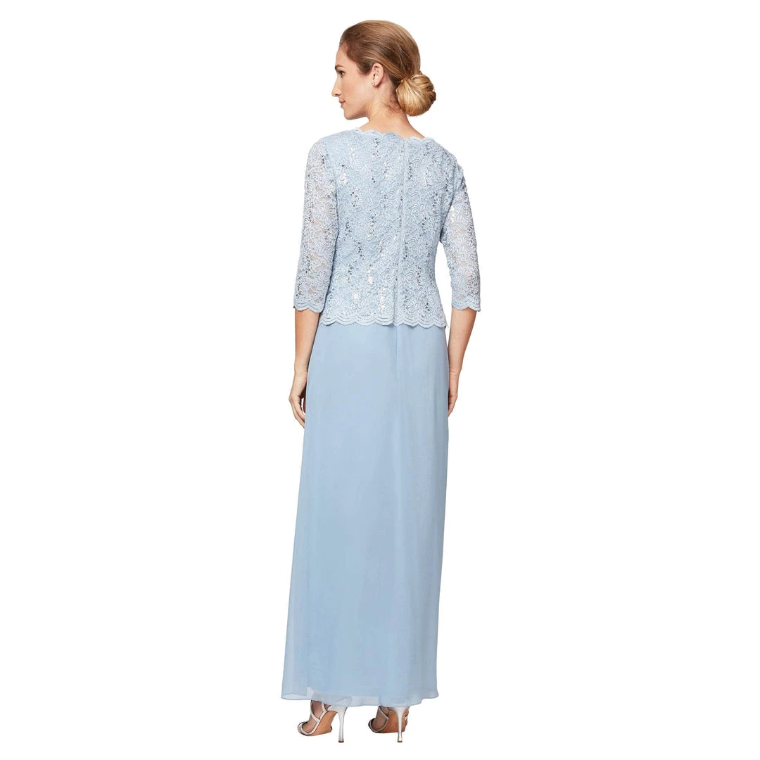 Show your sophisticated sense of style in this special occasion lace and chiffon ensemble by Alex Evenings 212318. This faux two-piece dress charms in quarter length sleeves and bateau neckline with scalloped edged bodice richly crafted in lace with iridescent sequin accents. The raised full back secured with hidden center zipper. The chiffon skirt flows towards the floor in an A-line silhouette. Make a lovely statement with this Alex Evenings masterpiece.