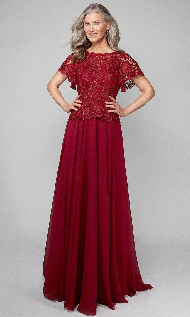 Enter that spectacular event in style in this Alyce Paris 27469 creation. Intricately tailored on a chiffon fabric, this modest piece flaunts a bodice, with high neckline and short sleeves. Sweetheart lining is a little bit seen through with its lovely floral lace overlay, as the skirt flourishes down to its full length with a brush train finish. Great for a formal wedding as a guest, mother of the bride and special church gatherings, this dress is a perfect choice. Impress the stunning crowd in this Alyce Paris masterpiece. Model is wearing Wine color.