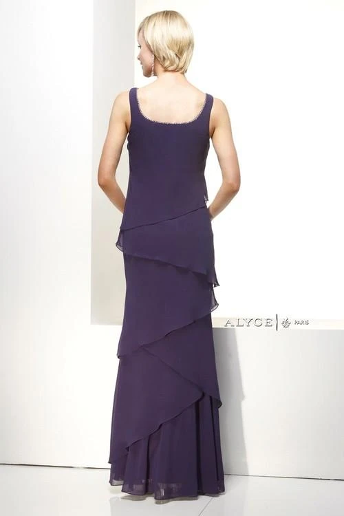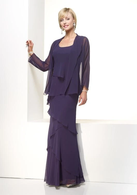 This Mother of the Bride chiffon dress has a sleeveless, scoop neckline bodice with an asymmetrical tiered floor-length skirt. This gown comes with a matching long-sleeved jacket.