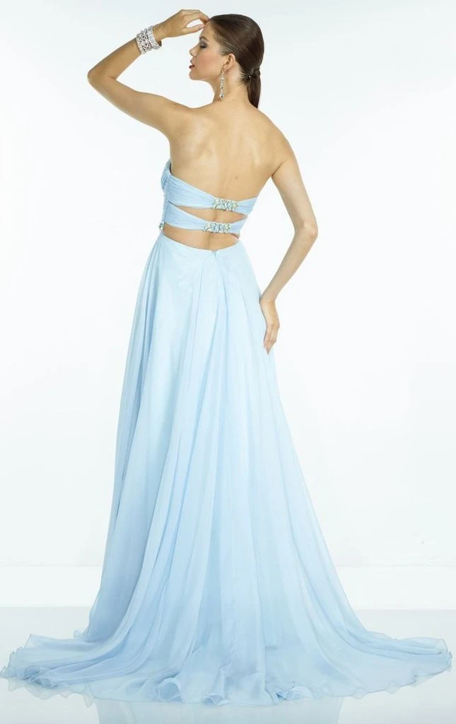 | Details: | Strapless, Ruched Bodice, Beaded Waistline, Side Slit, Chiffon, Full Length, Flared, Mid Open Back, Ruched Back Staps, Back Cut Outs, Back Zipper |