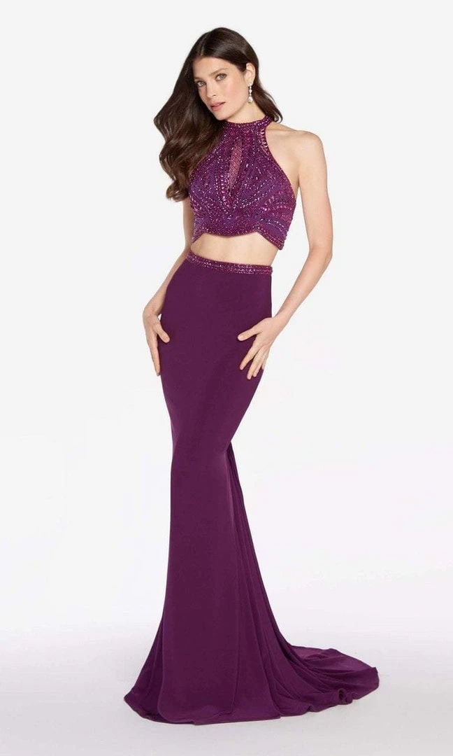 Radiate stunning perfection when you saunter into that spectacular ballroom in this Alyce Paris 60014 creation. Exceptionally adorned with a divine beadwork accented with deep illusion overlaid cutout and cut-in shoulders. Ornate straps connect to the mid-open back with scalloped hemline that highlights the bare midriff. Adorned with tonal beadwork along the natural waist, the jersey skirt features a dazzling mermaid finish that includes a lovely sweep train. Look classy and sassy as you stun everyone in this Alyce Paris masterpiece. Model is wearing the Eggplant color.