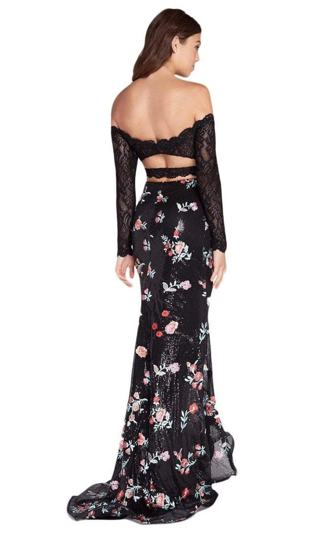 Get ready for everyone to stop and stare when you show up in this eye-catching evening gown by Alyce Paris 60187. The lace crop top boasts long sleeves, an off-shoulder neckline with scallops trim and back cutout. The coordinating form-fitting sequined skirt is adorned with floral embroidery and finishes in a sweep train. This Alyce Paris style is one of those staple looks you can wear for many occasions.