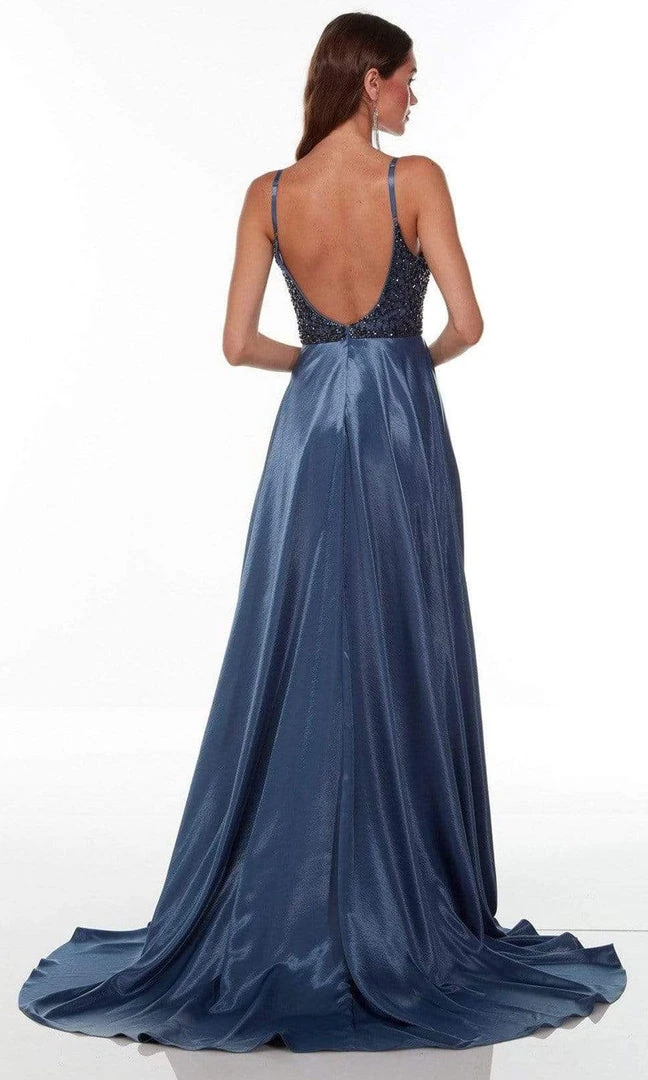 Don a style that is mesmerizingly feminine in this Alyce Paris 61197 creation. Ornamented with beadwork on the bodice, this spaghetti strap piece flaunts a plunging v-neckline with an illusion inset. Beautifully scooped at the back, the sleek A-line skirt reveals a slit and a sweeping train. Be the definition of allure in this Alyce Paris masterpiece. Models are wearing the Dark French Blue, Forest and Lilac Grey colors.