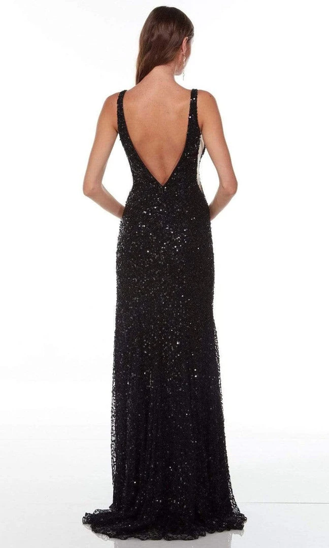 Be ready to sparkle in style in Alyce Paris 61216 creation. Gorgeously designed in hand-beaded embellishment, this gown features a fitted bodice with sleeveless, plunging V neckline and side sheer panel. The back displays a V-shaped open cut that points down the waistline, followed by a center zipper closure. A side slit accents the sheath silhouette to perfectly elongate your sexy leg with fringed detail and finishes with a brush train. This Alyce Paris evening gown is designed with sophistication in mind, it is your perfect choice for prom, pageant or any special event. Model is wearing Black color.