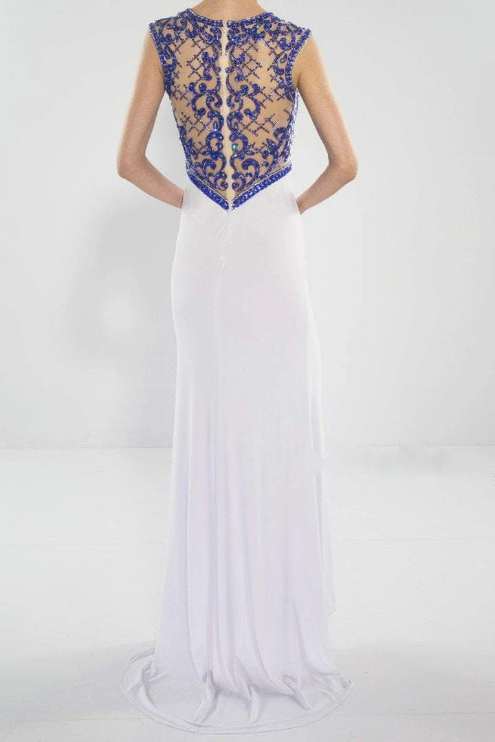 Dazzle everyone in this elegant cap sleeve long gown with sweep train featuring sheer beaded bodice with front slit and beautifully beaded sheer back.