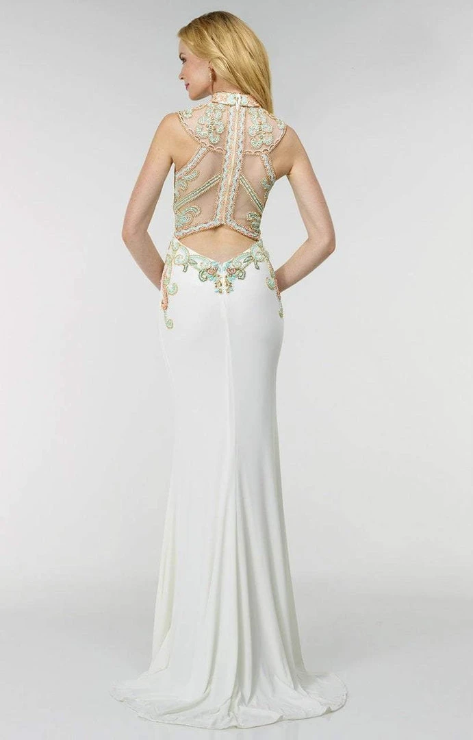 You will be obsessed with this jewel patterned bodice and cut out back of this dress. Even better, a sheer illusion beaded high neck line to go with the jersey dress.