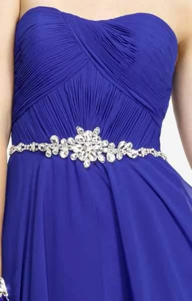 Get the party started in this spectacular evening dress from Alyce Paris 6545. A strapless chiffon dress with delicate ruching details in modified sweetheart bodice. Cinched at the waist with crystal waistband, this gorgeous ensemble cascades to the full-length A-line silhouette hem in luscious layers of silky chiffon. Keep it simple in Alyce Paris and beam in elegance! Model is wearing the dress in Sapphire.