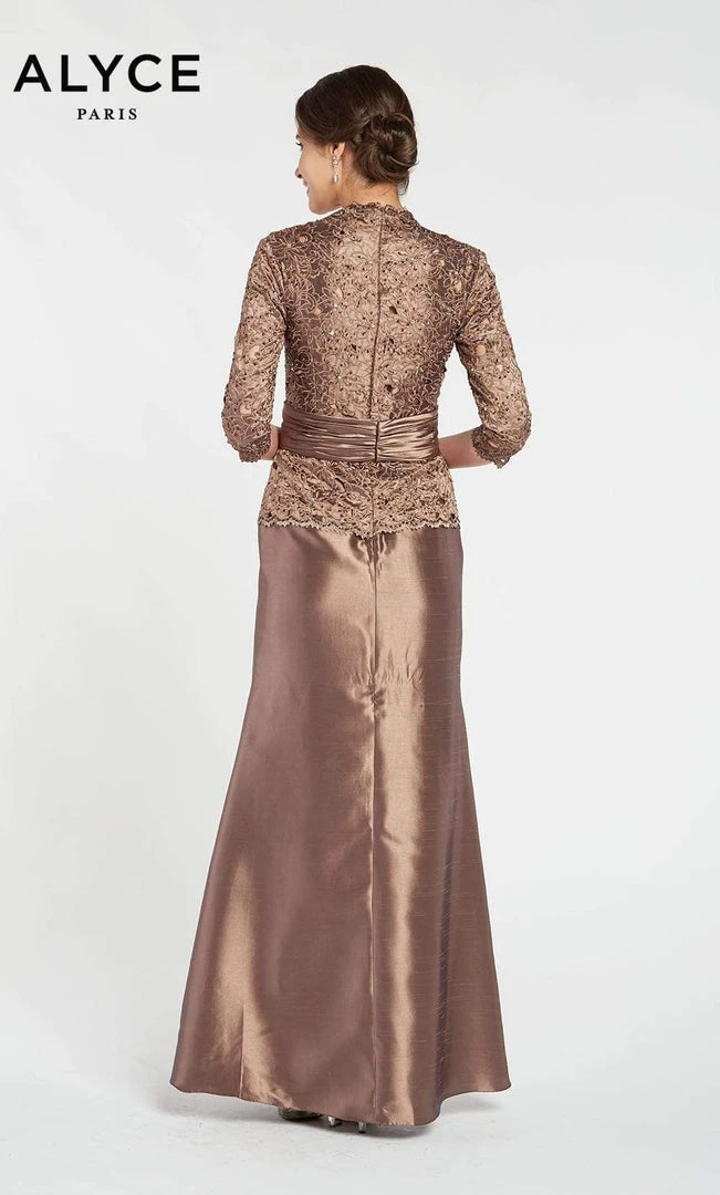 Show off your classy style when you wear this sophisticated Alyce Paris Black Label 29143 Evening Dress. A three-quarter sleeves gown with a subtle scalloped-trimmed V-neckline bodice, crafted in rich lace material. The waist features a ruched band. The laced top extends below the waist, giving way to the silky textured fabric of the skirt that drops with back godet making up a mermaid silhouette finish. This classy style by Alyce Paris Black Label is charming and versatile, perfect for social galas and weddings. Please note the dress does not include the floral accent at the belt.