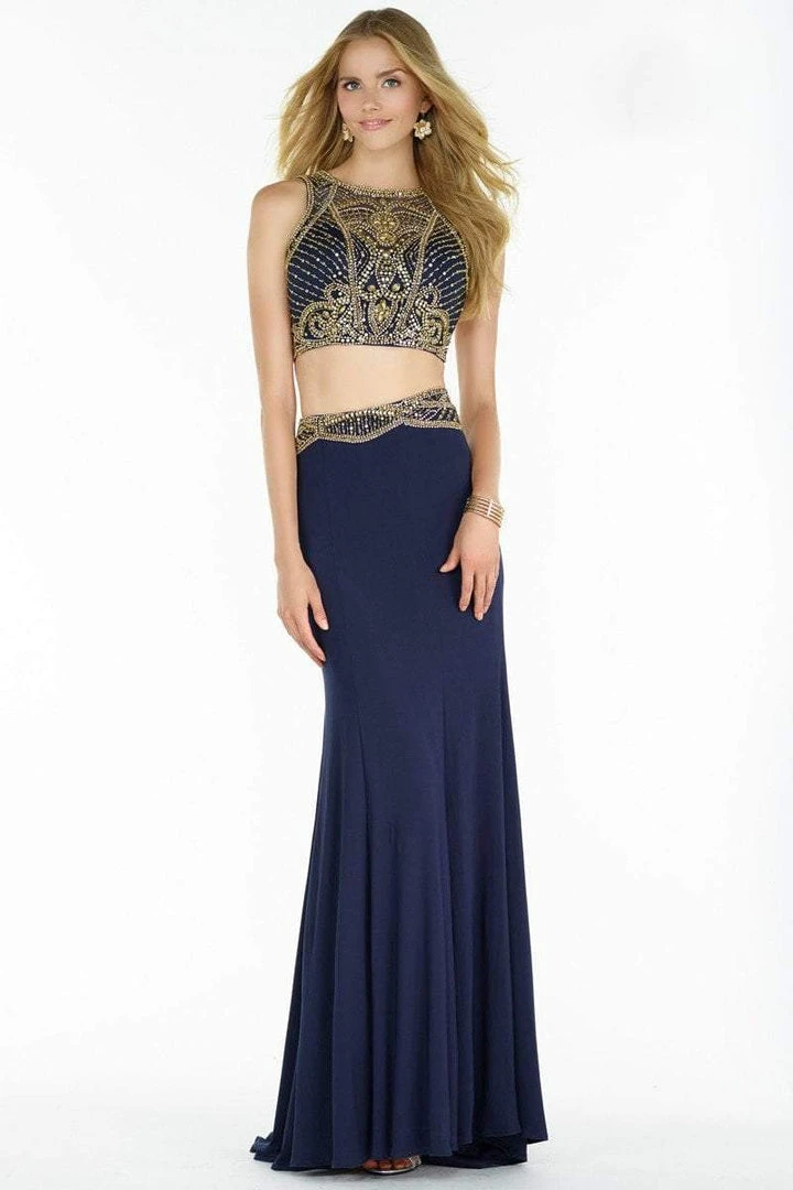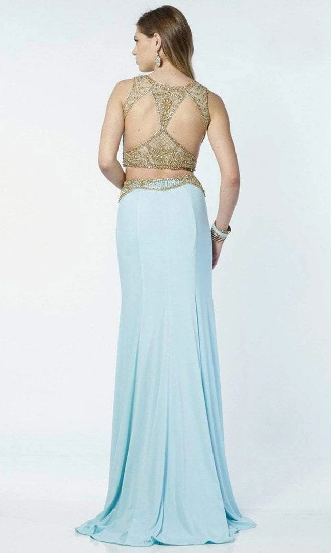 Two piece, jersey skirt with a sweetheart neckline, illusion embellished crop top, racerback with two keyholes.