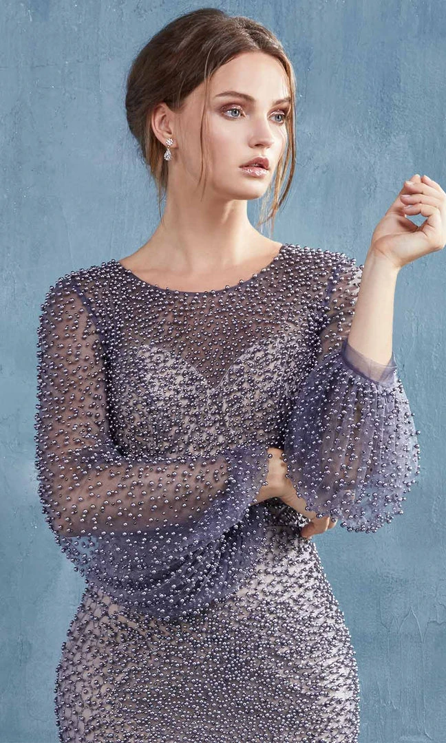 Look fantastic for your next formal event in this evening gown by Andrea and Leo A0997. The scoop neckline and sheer, blouson-length sleeves of this glitzy dress make it a stand out from the crowd. An illusion sweetheart lined bodice and a full-length trumpet skirt with a horsehair hemline and sweep train finish make this dress fashionable for your occasion. This Andrea and Leo creation is truly remarkable! Models are wearing Blush and Dusty Blue colors.