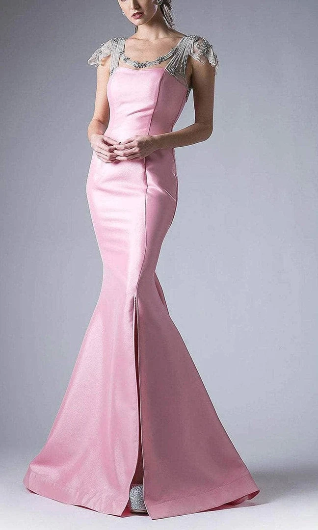 Create a distinction with a regal flair in this exquisite Andrea and Leo A5007 creation. Sculpted with tailoring seams on a luxe satin silhouette, this gown charms with a beaded scoop neckline with an elegant cutout accent. Cap sleeves are embellished with a sheer accents and beadwork. Designed with a captivating low square cut back, the mermaid skirt reveals an alluring slit as it sculpts and flares into a sweeping train. Accentuate your finest assets flawlessly in this classy beauty by Andrea and Leo. Models are wearing the Emerald, Navy and Rose colors.
