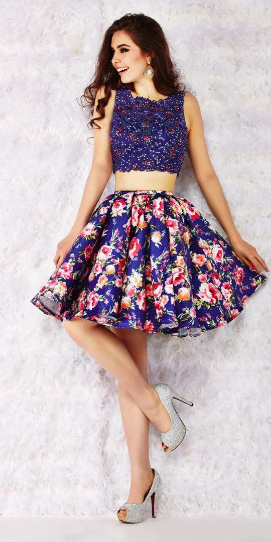 Be the star of any garden party or homecoming with this attractive two piece homecoming dress featuring a cheerful floral pattern. Two pieces are hot in the fall collection and this halter and short flared skirt will have you feeling confident and sexy.