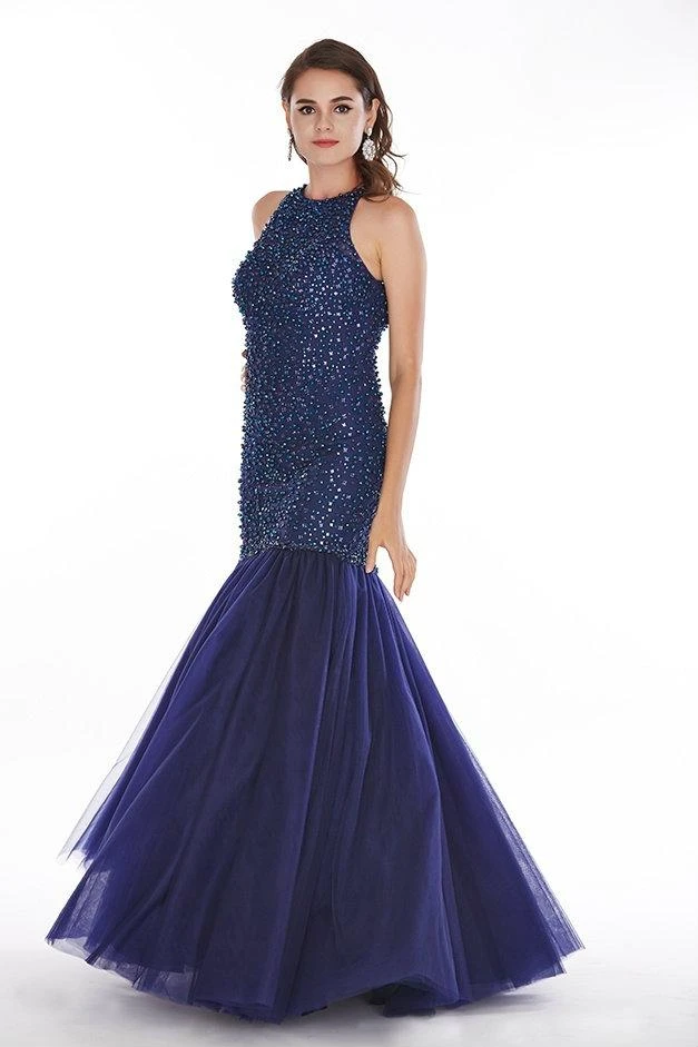 A sleeveless sequin-glossed gown with a subtle open back. The mesh sweeping skirt completes this show stopping style.