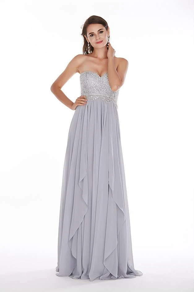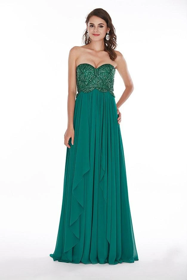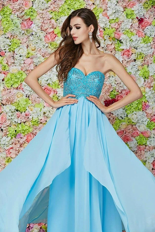 Floor length sweetheart neckline from our A and A Spring 2016 Collection. This astonishing strapless sweetheart gown has a classic design. It features a bedazzled bodice with a layered skirt. Perfect for a variety of evening events including prom.