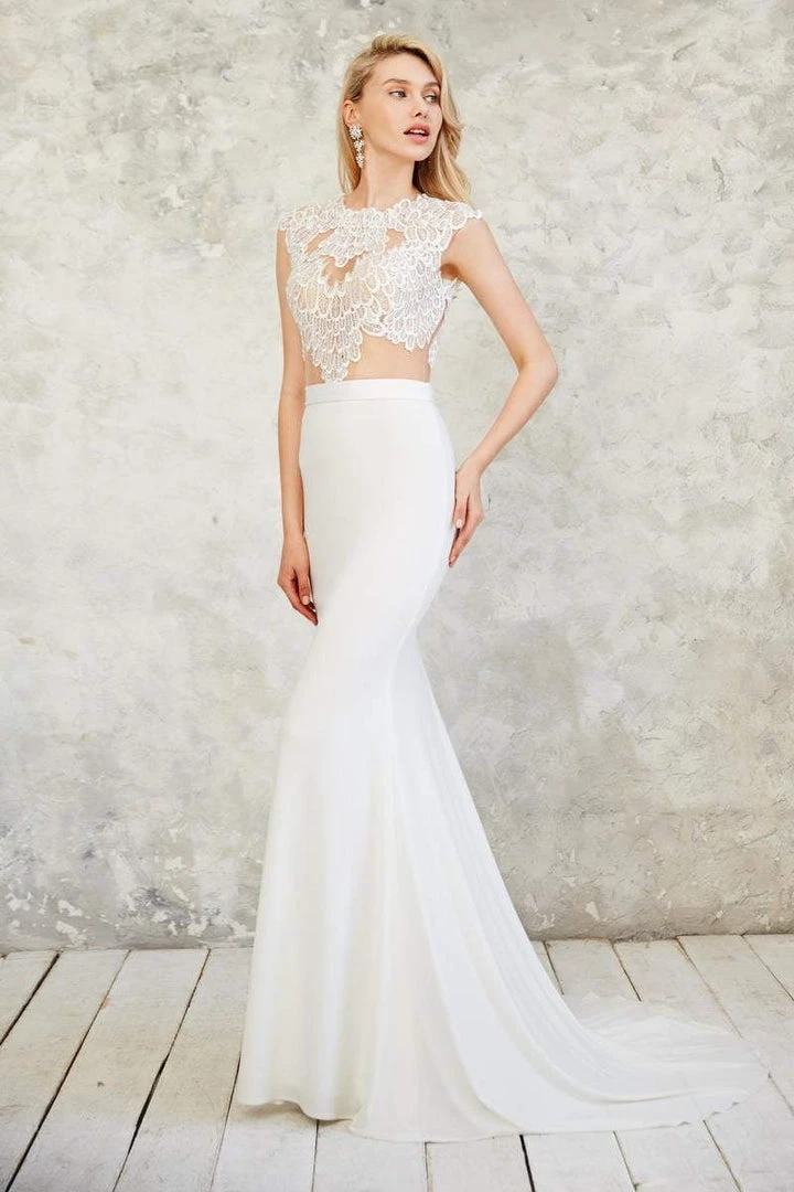| Details: | Cap sleeves, Lace bodice, Beaded, Sheer sides, Solid waistband, Back cutout, Back zipper closure, Sweep train |