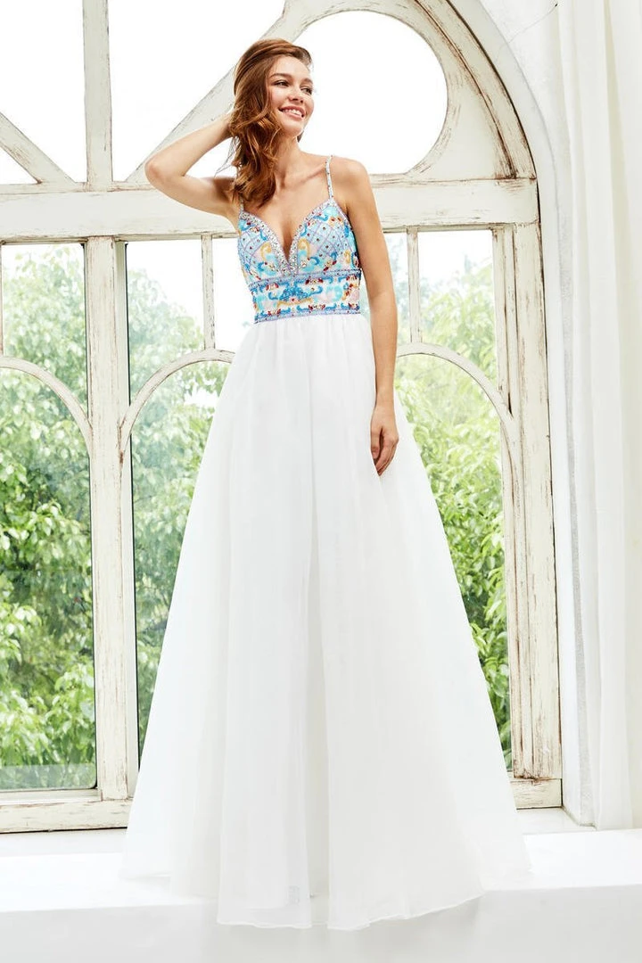 | Details: | Sleeveless, Spaghetti strap, Beaded bodice, Mid-open back, Layered chiffon skirt |