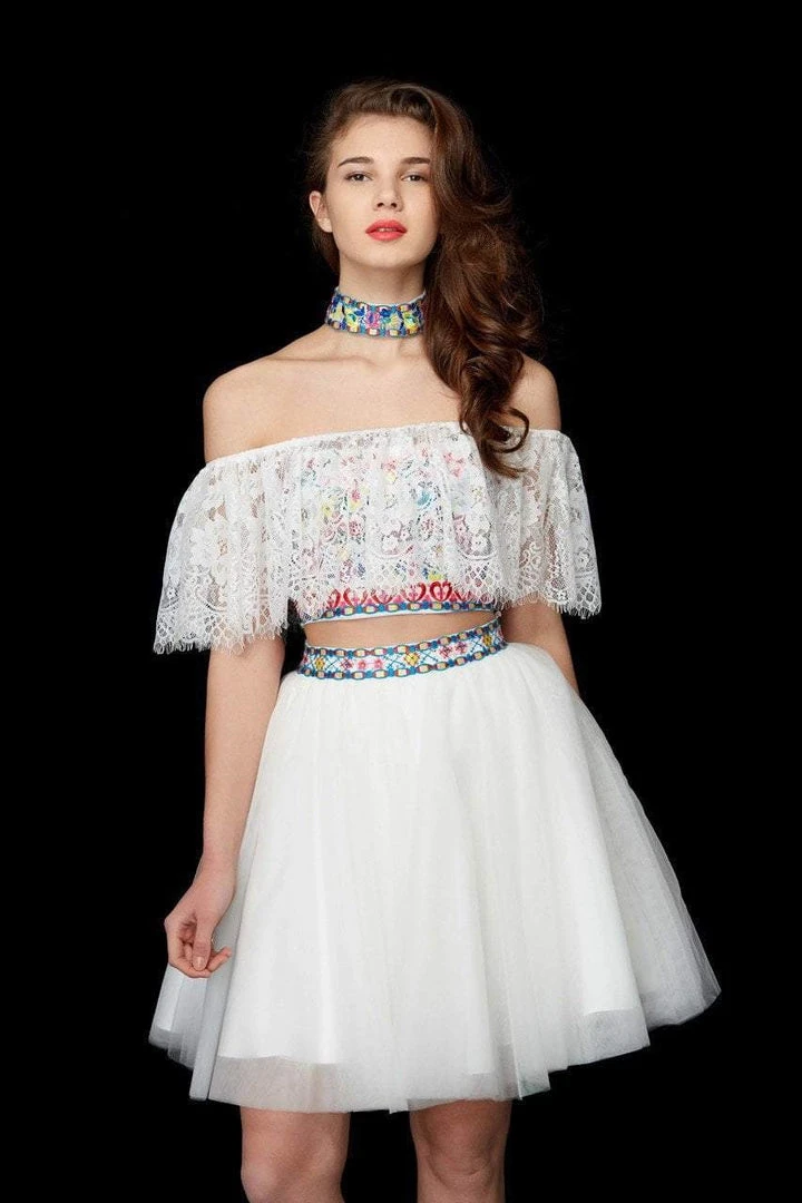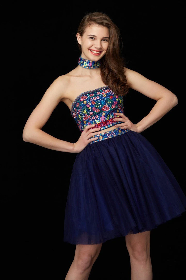 Look immaculately stunning in this bohemian-inspired Angela & Alison 72022 creation. Unveiling a spectacularly vibrant spectacle of floral embroidery festooned on this lavish piece, this knockout has an embellished choker, a strapless straight-across neckline and a mid-open back on a cropped top. Embraced along the natural waist with a vividly ornamented band, the tulle layered skirt flares in lovely pleats that completed at a short hemline. This ensemble has a sheer intricate lace with scalloped hem that can be overlaid to mimic an off-shoulder style. Showcase your brilliant fascination with free-spirited style in this gorgeous Angela & Alison masterpiece.