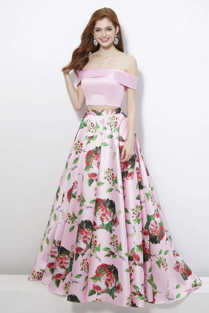 Be the spectacular belle on your next formal event in Angela & Alison 81120! This gown features a two piece set with an off the shoulder crop top. The back has a center zipper closure. The ballgown skirt runs in full length hem with striking floral print details and finishes in a sweep train. This Angela & Alison gown is sure to make a daring statement in that special affair!