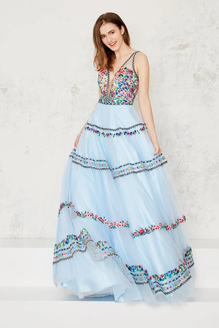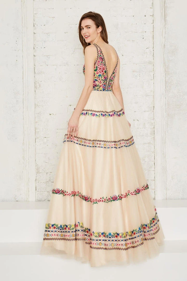 | Details: | Sleeveless, Floral, Sheer Inset Detail at the Bust, Beaded Stripe Accents, Full Length, V Back, Back Zipper Closure |