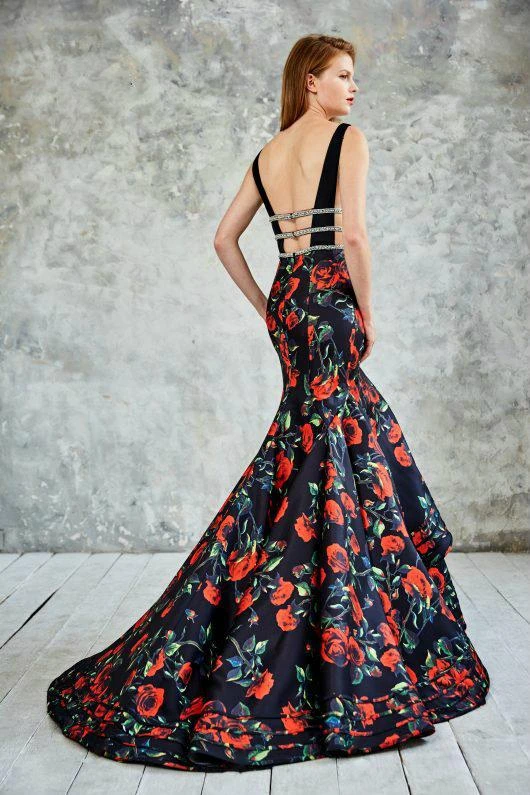 Make the most extravagant entrance in this gorgeous Angela and Alison 771030 long evening gown. This mermaid stunner features a lovely rose print on its flared skirt, sheer side cut outs and a plunging sweetheart neckline. Intricately beaded straps traverse from front to open back for an added touch of glam. Exude that enthralling vibe in this divine florid piece by Angela and Alison.
