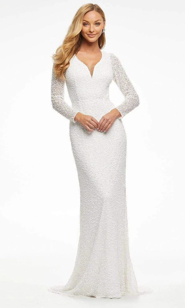 Get ready to be captured in picture of sophistication in this Ashley Lauren 11080 dress. This evening dress fashions a plunging V neckline supported by long sleeves in a fitted and sequin bodice. Revealing a sheath silhouette, this also shows a back keyhole with back zipper closure to complete the look. You’ll be positively radiant in this Ashley Lauren creation.