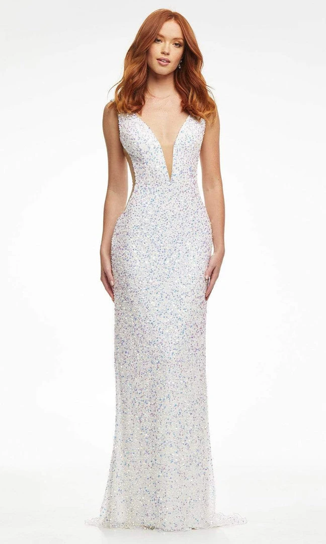 Look fashionably chic and fabulous in this alluring Ashley Lauren 11081 dress. This evening dress features a plunging V neckline in a fitted and sleeveless, sequin bodice with illusion cut outs on the side. The skirt reveals a sheath silhouette while the back shows a V back with back zipper closure. Get the party started in this spectacular evening dress from Ashley Lauren.