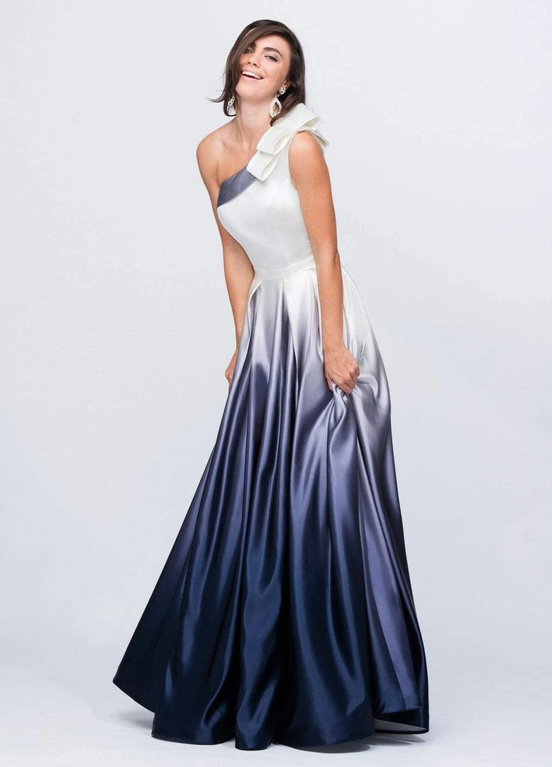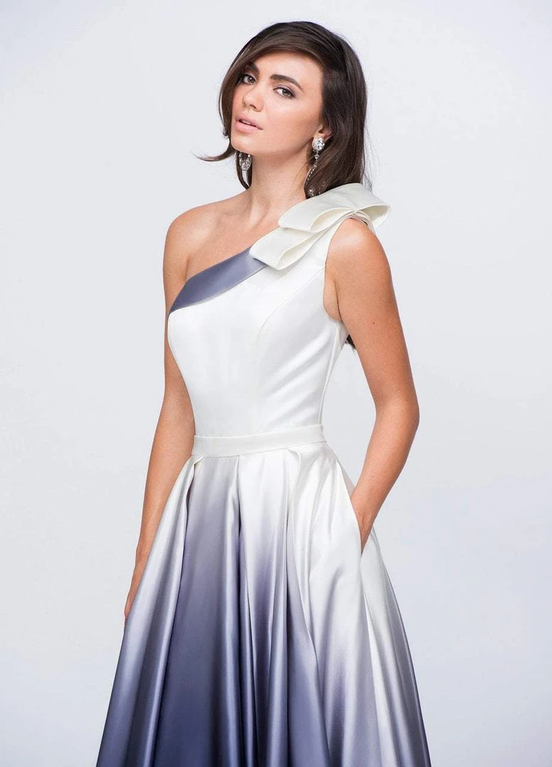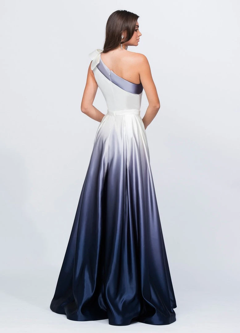 Choose this Ashley Lauren 1132 dress for a stunning look for your evening occasion. Glams in a sleeveless, asymmetric neckline with a bow detail at one shoulder. The bodice has a back zipper closure while the waist is cinched in a thin belt. From the natural waist begins a full length ombre satin A-line skirt with pockets. Mesmerize the crowd as you strut in this Ashley Lauren evening dress.