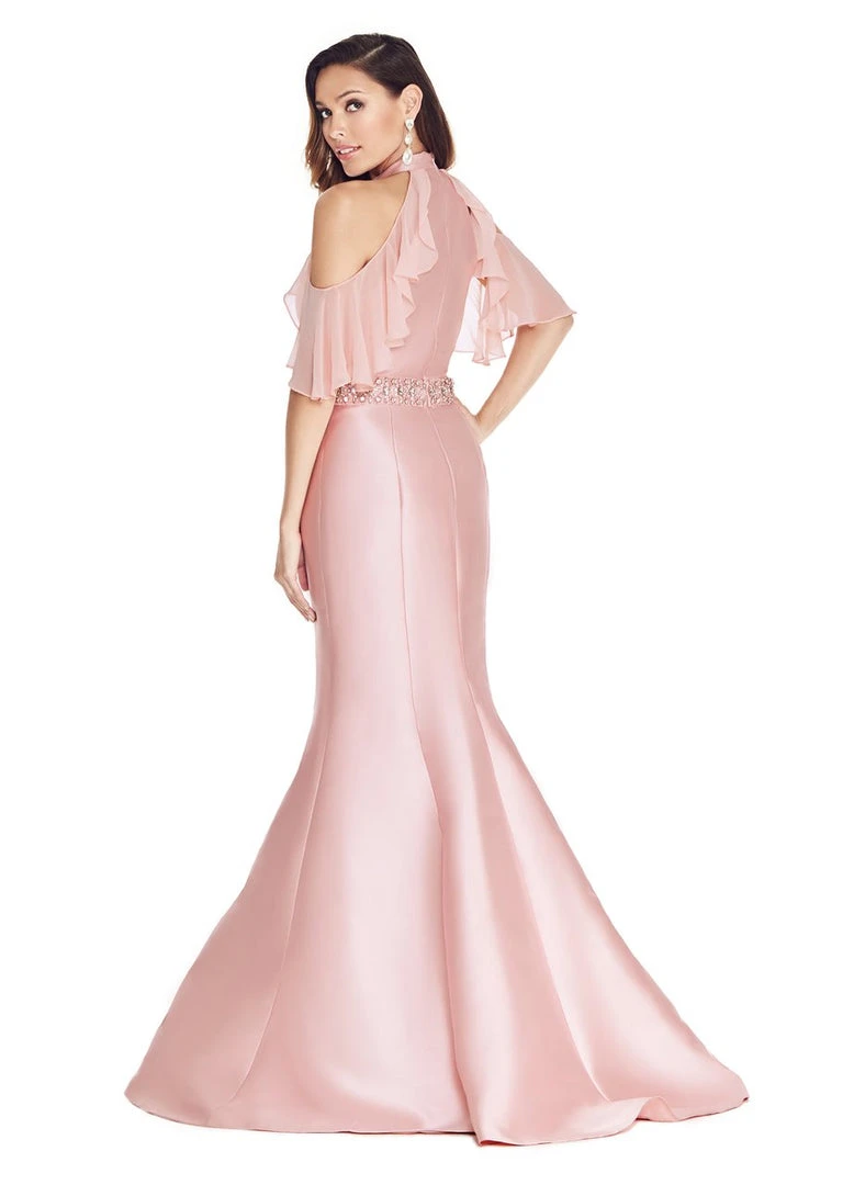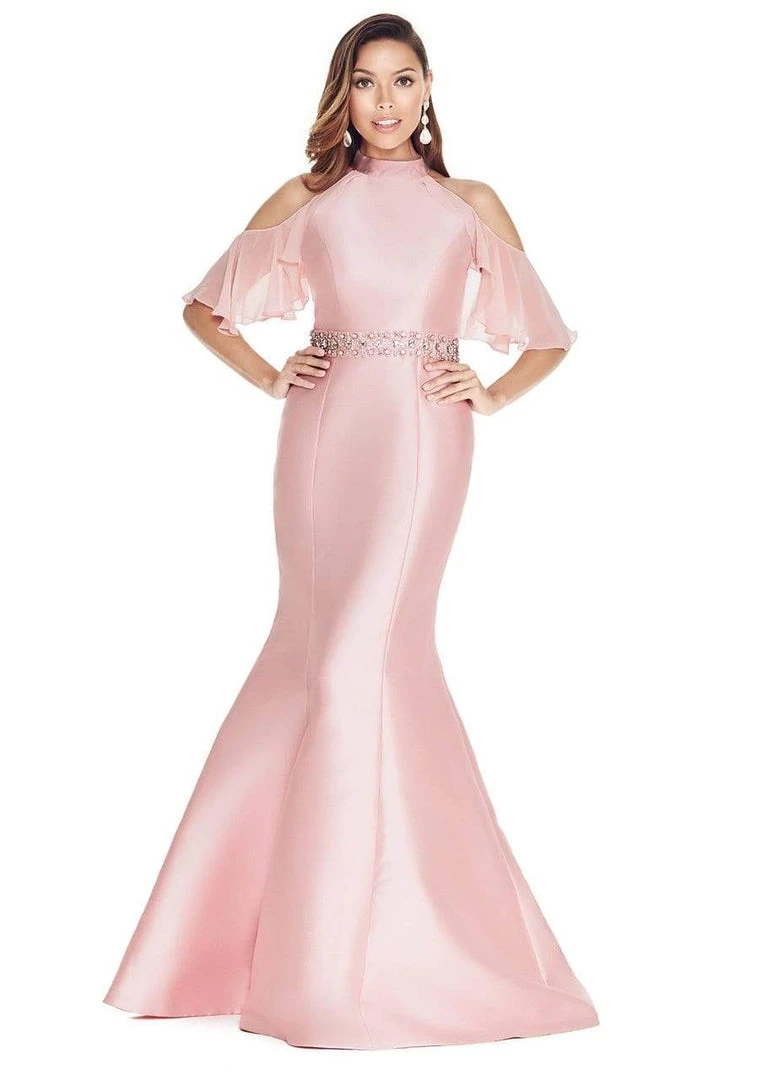 Take his breath away as you dreamily glide into the ballroom in this Ashley Lauren 1275 creation. Streamlined with sculpting seams on a sleek Mikado fabric, this stunner shows off a high halter neckline highlighted with gorgeous cold shoulder details and draped with sheer flutter half-sleeves. Tailored with a sexy racerback that perfectly presents those sexy cut-in design, a tonal rhinestone embellished belt wraps the waist oh so exquisitely. The mermaid skirt flawlessly skims from the curves of the hips before flaring down with a dashing train. Peak their interest when you walk with spectacular flair in this Ashley Lauren masterpiece.