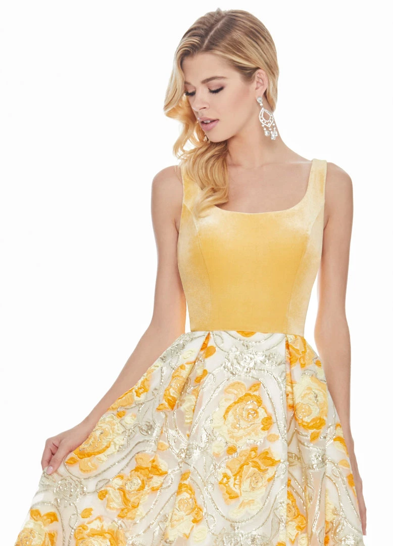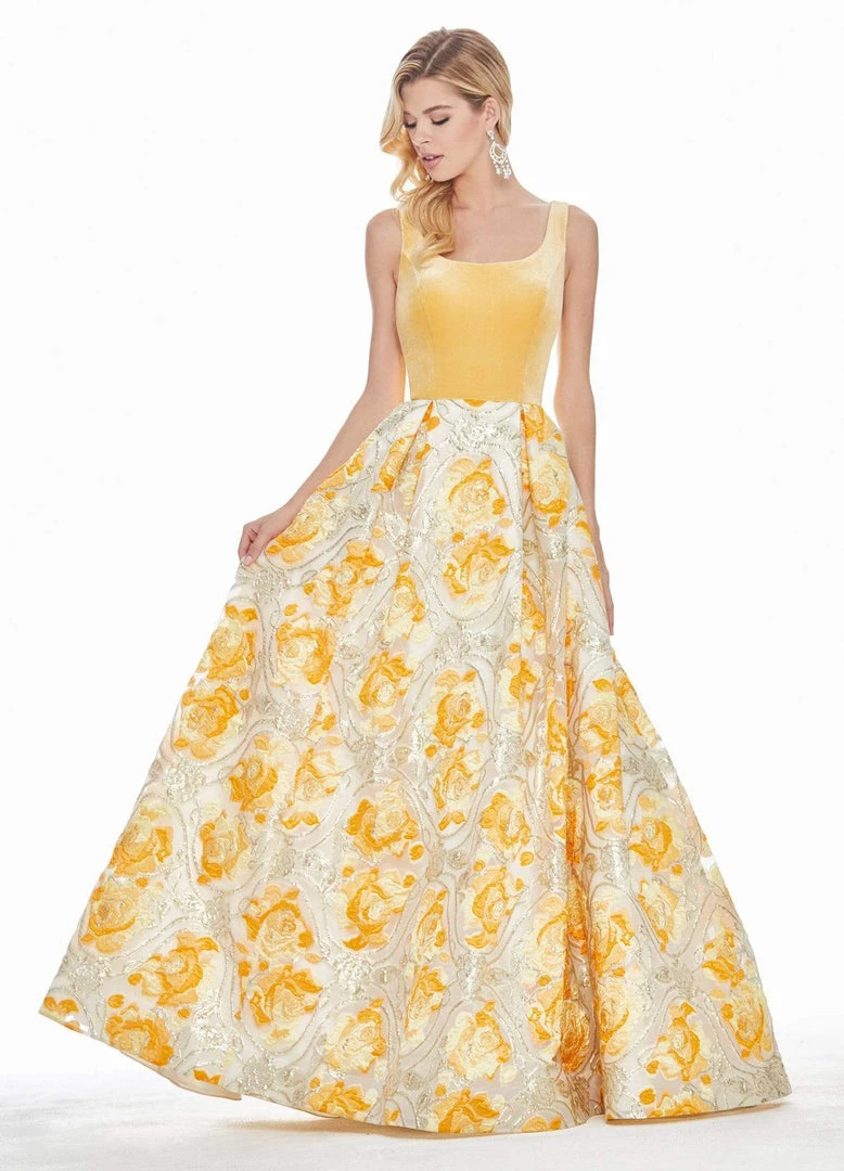 Create an aura of sophistication while looking so regal in this Ashley Lauren 1345 creation. Crafted in a vibrantly-colored sleeveless velvet bodice, this rich ensemble flourishes a scoop neckline and a deep v-open back. The metallic brocade ballgown skirt flares in lush box-pleats that cascades down to a trailing court train. Whirl and twirl with poise and grace in this picturesque Ashley Lauren masterpiece.
