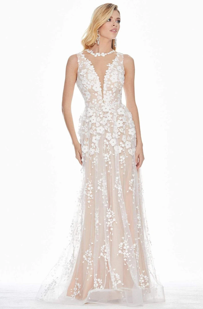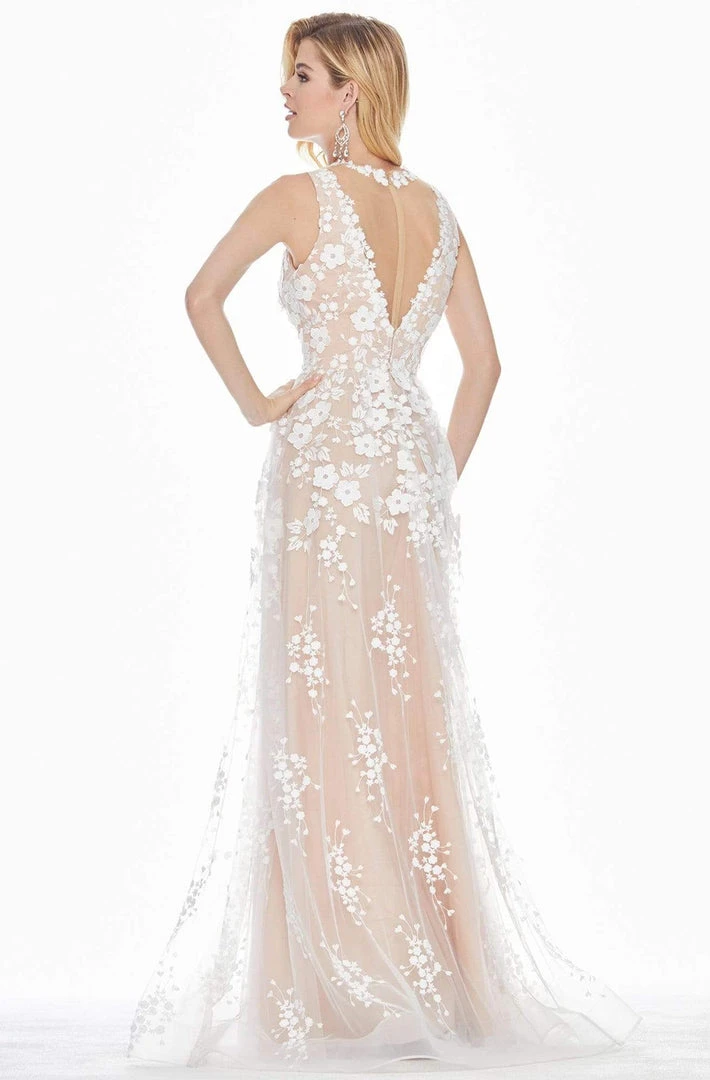 Fabric in embroidered organza with nude tone inner lining, this sleeveless romantic piece features an Illusion plunging V neckline with sheer mesh inset, fashions in a fitted bodice with floral appliques and embroidery. The back features a sheer keyhole cutout with center zipper closure, while the A-line skirt runs in full-length with horsehair hemline.