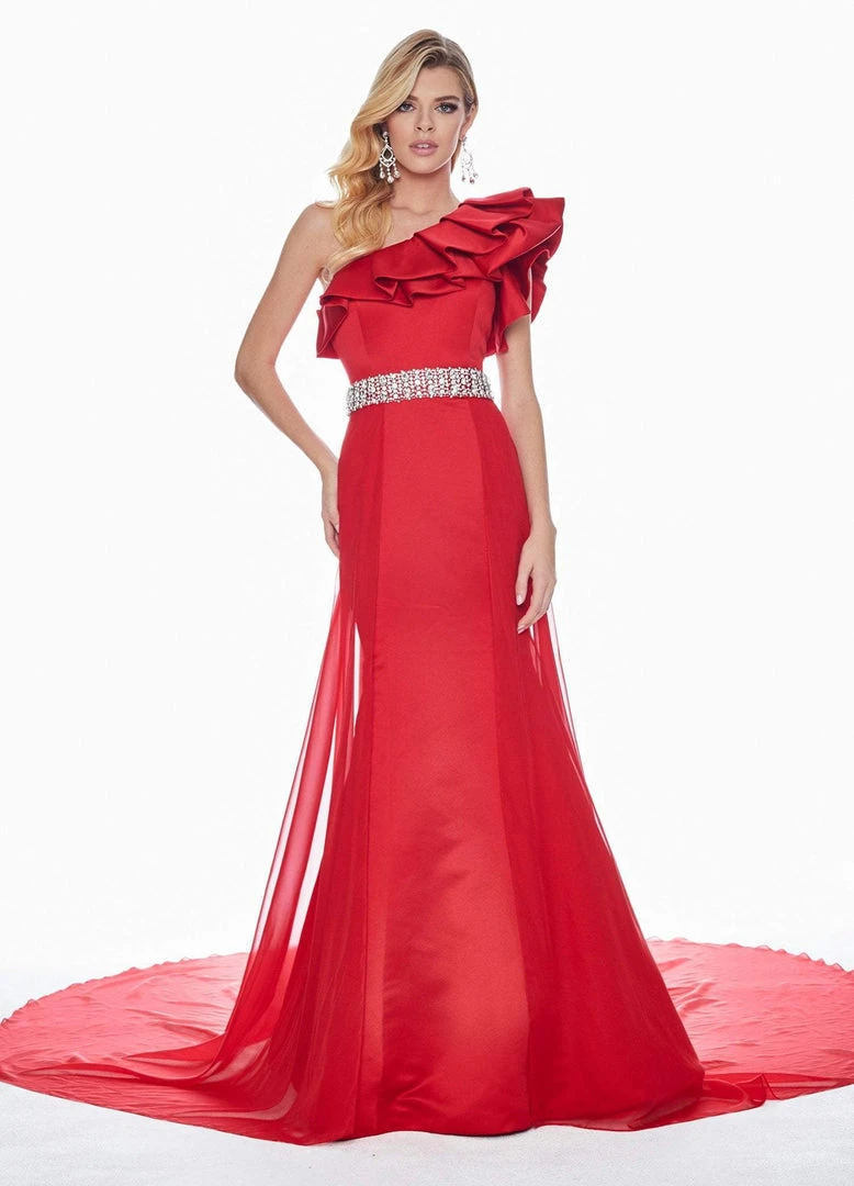 Mesmerize everyone with your stunning presence in this Ashley Lauren 1398 creation. Sculpted in a heavy satin fabric in a gorgeous fitted design, this chic piece shows an asymmetrical neckline and a slanted mid-open back with pleated ruffled panels. Draped with panels crafted into a cap sleeve, the natural waist is glittering with beautiful rhinestones. The mermaid skirt glides along the hips and flares down to the floor in a full-length hem. A sheer chiffon overskirt streams into a court train. Glide into the room with an amazing flair in this Ashley Lauren masterpiece. Model is wearing the Red color.