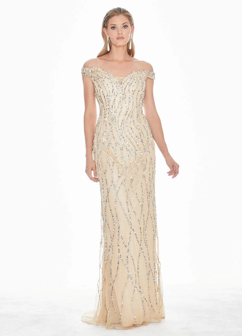 Be dressed up stunningly in this alluring evening gown by Ashley Lauren 1429. Styled in embroidered sequins, this dress features a fitted bodice with an off-shoulder neckline with sheer inset detail at the bust. This gown reveals a sheath silhouette that flows down to the floor completed with a sweep train. The back is secured with a center zipper closure for a figure-flattering fit. You will be positively radiant in this glimmering Ashley Lauren masterpiece.