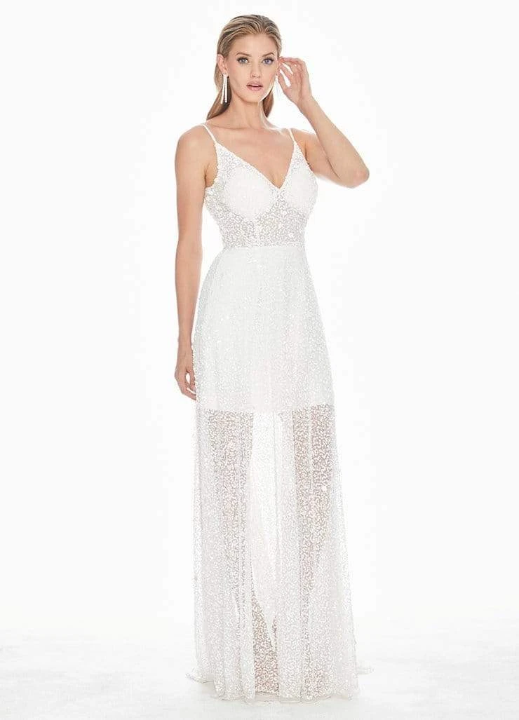Get glamorous underneath the sheer and sparkly details of this evening gown by Ashley Lauren 1459. This fully sequin and bead embellished evening dress features a sheer A-line silhouette. The bustier has a V-neckline and low scoop back held by spaghetti straps on the shoulder. The beaded skirt flows to the floor with sweep train, while the jersey lining stops at mini-length. Get noticed from head to toes in this radiant dress by Ashley Lauren.