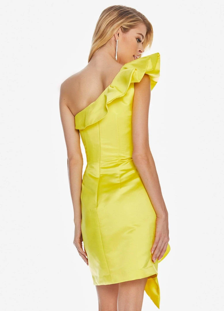 Be strikingly gorgeous in this cocktail dress by Ashley Lauren 4171. Features a sleeveless, sweetheart/asymmetric neckline with one shoulder accented with a cascading ruffle detail. The pleated bodice flourishes a fitted skirt and runs at mid-thigh hem. This Ashley Lauren creation is truly a definition of glamour.