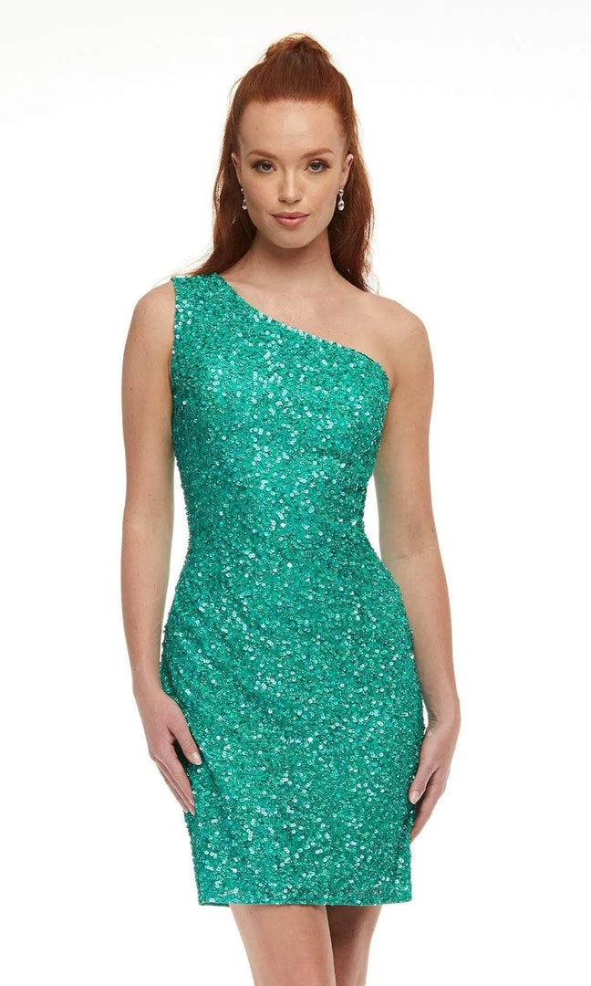 Steal the show in this spectacular fully beaded cocktail dress, showcasing an asymmetrical neckline on a fitted bodice paired with lace-up back detail and a short-length fitted skirt.