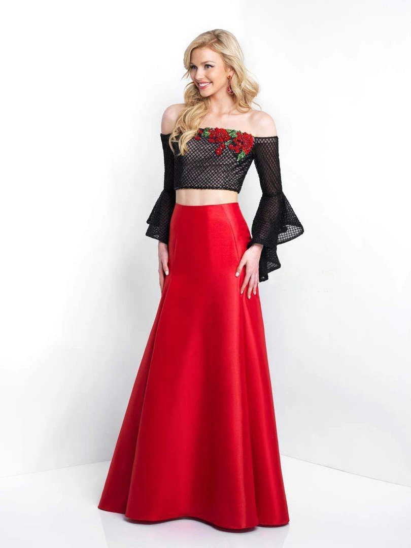 Turn heads instantly when you wear this Blush 11567 evening gown. This two piece creation features an off the shoulder bell sleeve crop top fashioned with an embroidered floral appliques along the bust and netting fabric giving a boho touch. The a-line skirt cascades to a floor length hemline finished with a sweep train. Take their breath away with this stunning Blush creation.
