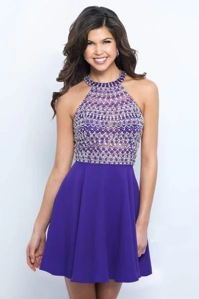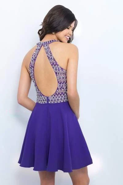 Leave him pining over you as you outshine everyone in this dazzling Blush 11375 creation. Embellished with an intricate stripe beadwork along its sheer cutaway bodice, this chic piece flatters with a high halter illusion over a sweetheart neckline. Paired with a teardrop cutout racerback, the A-line skirt flutters stunningly down to a playful short hemline. Make his heart skip a beat in this fabulously ornate Blush masterpiece. Models are wearing the Sapphire/Silver and Violet/Silver colors.