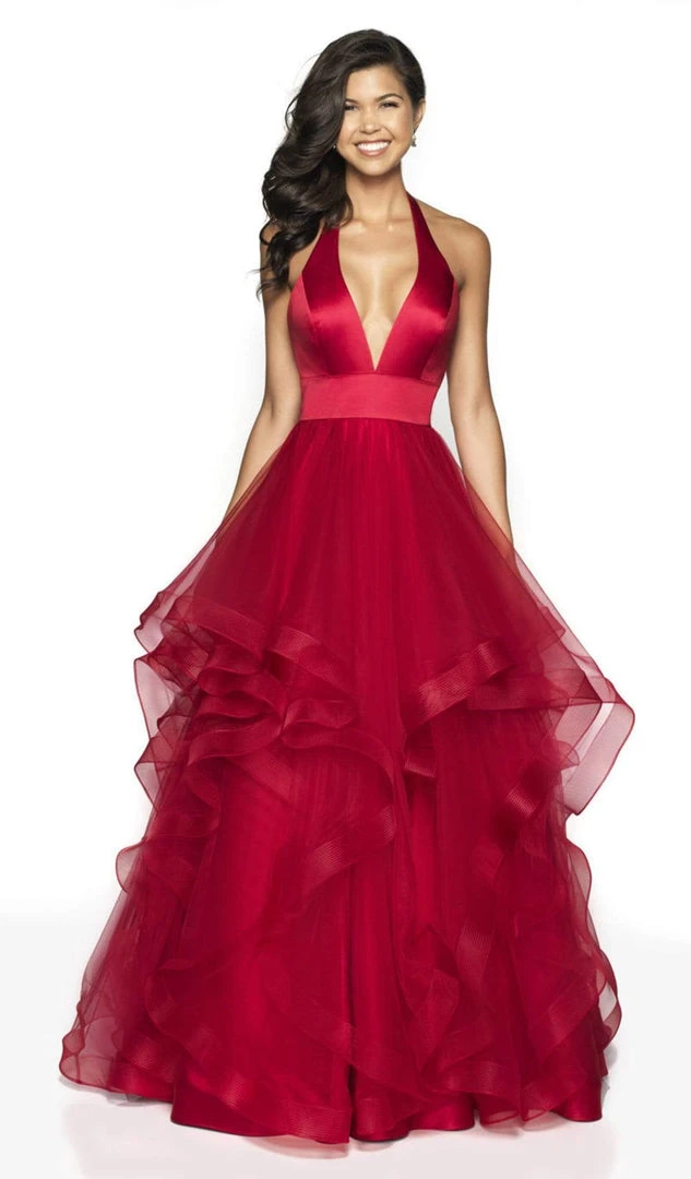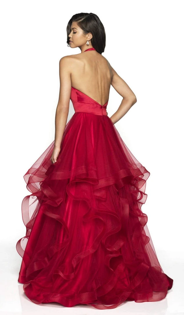 Be a woman of style and beauty in this chic gown by Flair Prom 19054. Appeals in a sleeveless, deep halter V-neckline with an open back. The back has a zipper closure and the tulle skirt flourishes a tulle ballgown skirt with a horsehair hemline. Everyone who sees you in this Flair Prom gown will be left speechless and giddy.