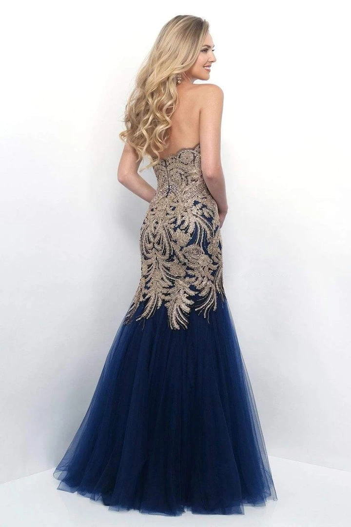 Charm every party with your goddess-like presence in this gilded lace creation by Blush 7107. Embellished with a lavish Baroque-like gilded lace appliques, the striking piece flaunts a strapless, scalloped sweetheart neckline and a mid-open back. Exquisitely molding from the hips down to the mid-thigh, the tulle trumpet skirt flawlessly glides and flares down to an astounding full-length hem. Dance in pure grace and beauty in this lavish stunner by Blush.