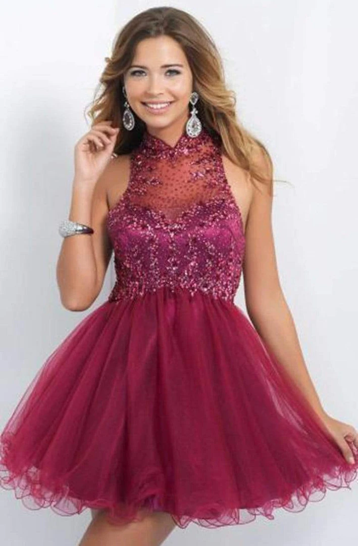 Look fresh and pretty in this homecoming dress from Intrigue 100 by Blush. This dress features a high neckline embellish with shimmering beads throughout neckline, bodice, and sheer back. Available in Cranberry, a sophisticated jewel color bound to make a statement. Imaginative design given by flirty overlay of tulle layered skirt. Go girl and celebrate! Have fun in Blush!