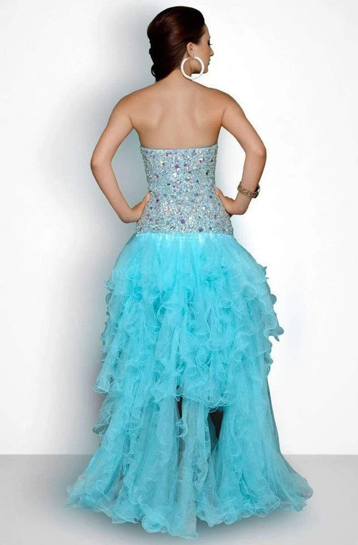 | Details: | Strapless, Crystal Embellished Bodice, Ruffled Hi-Lo Skirt |