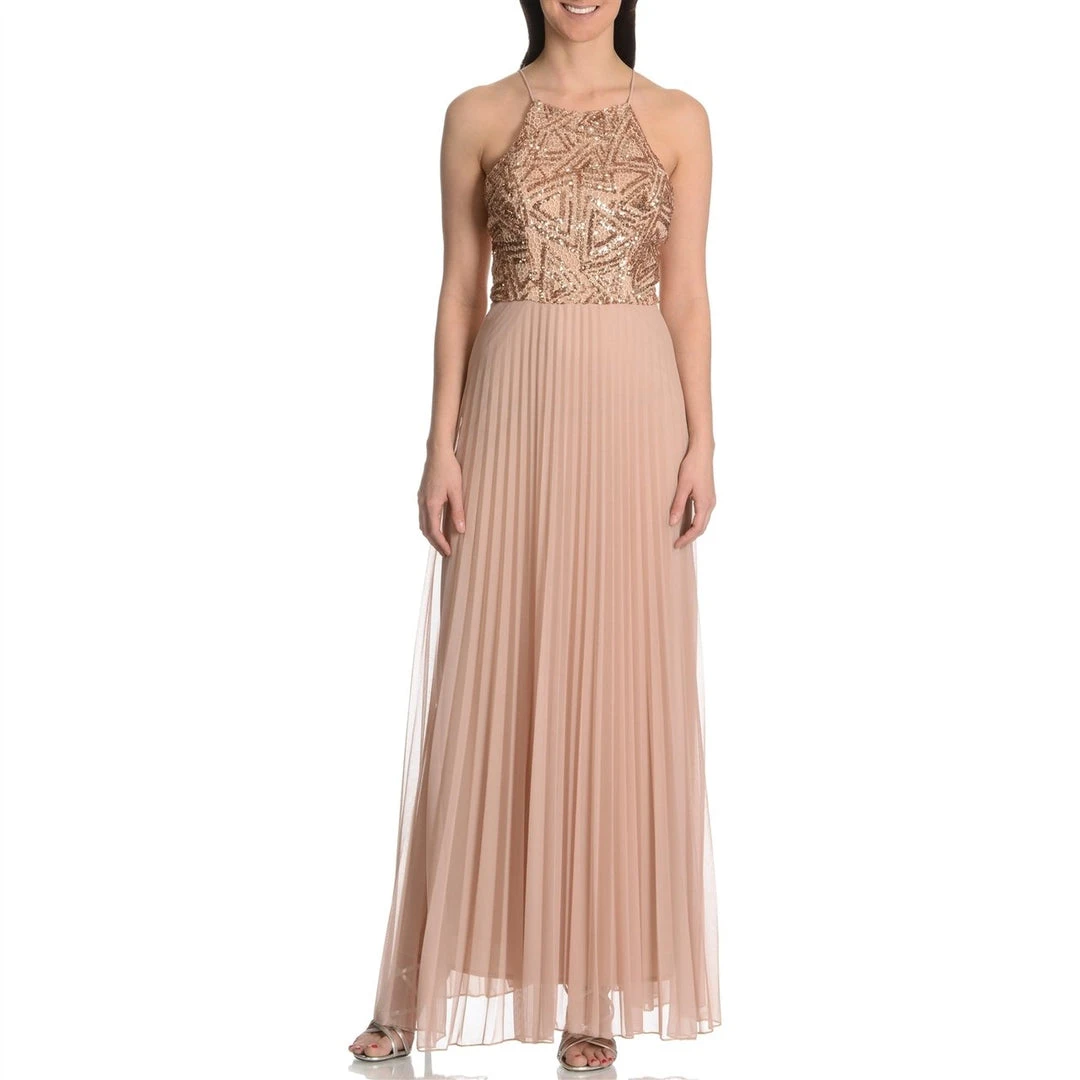 Get on the best dressed lists in this delightful evening gown by Cachet 56902. The sleeveless bodice has a flattering halter neckline and glitters with a stunning display of shining sequined embellishments for a regal and rich look. The full-length skirt dances to a full-length with accordion pleats and an A-line effect. This charming Cachet creation looks impeccable. Model is wearing Beige color.