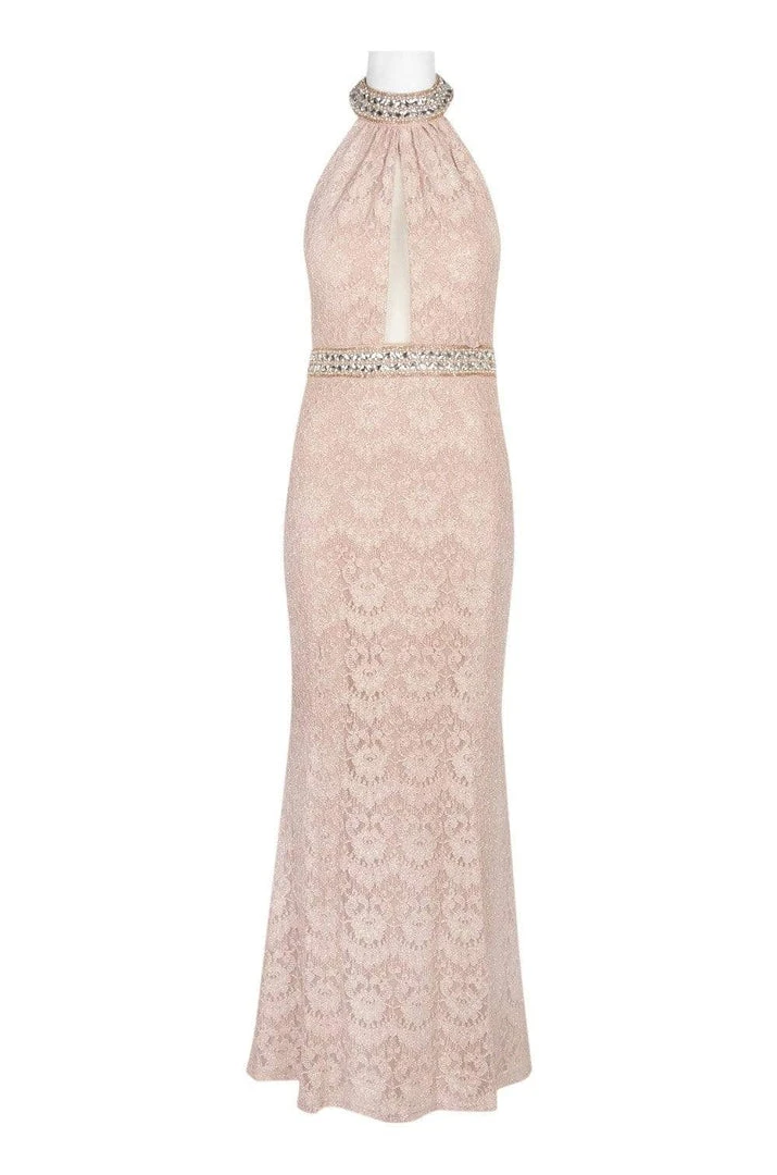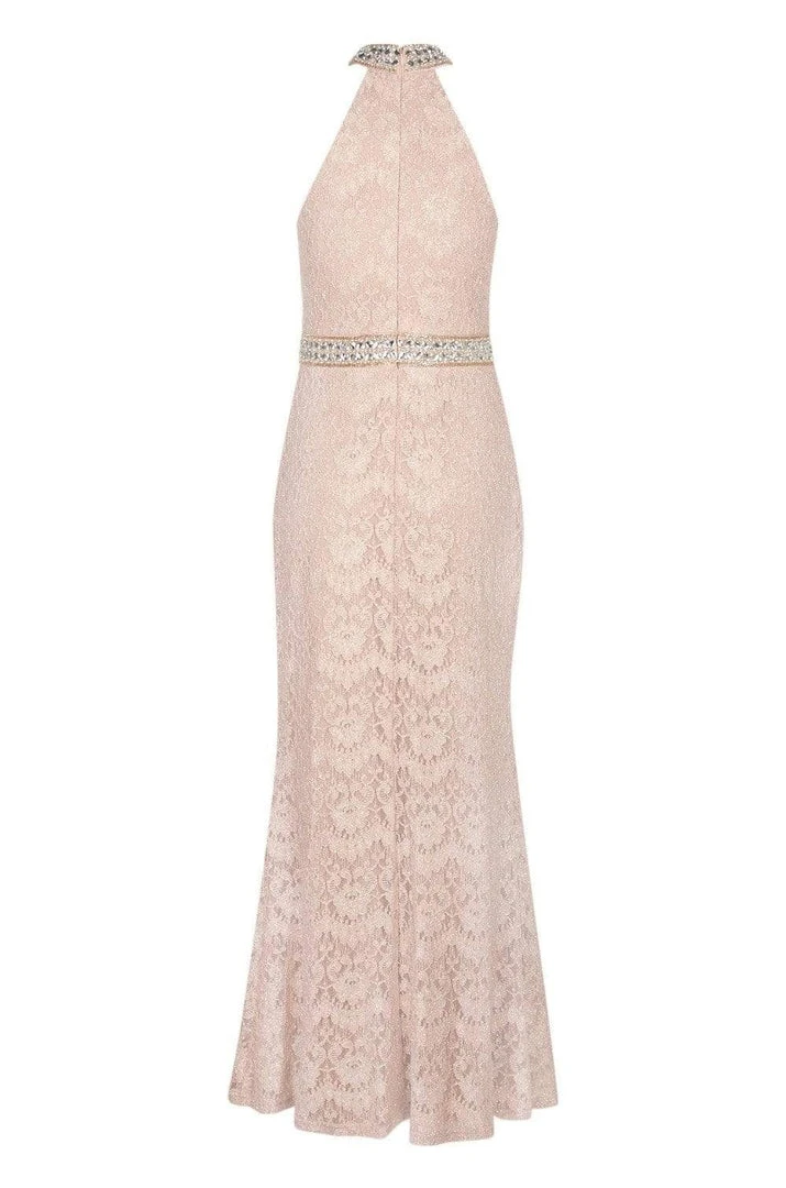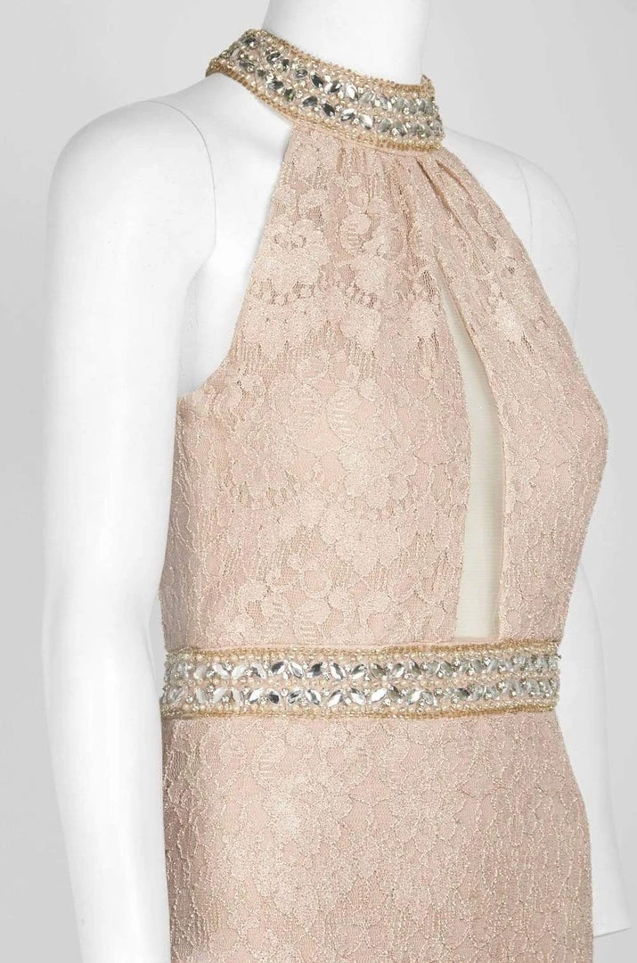 | Details: | Rhinestone and Beaded Collar, Embellished Waistband, Plunging Illusion Cutout, Allover Lace, Racerback, Back Zipper Closure, Full Length Hem |