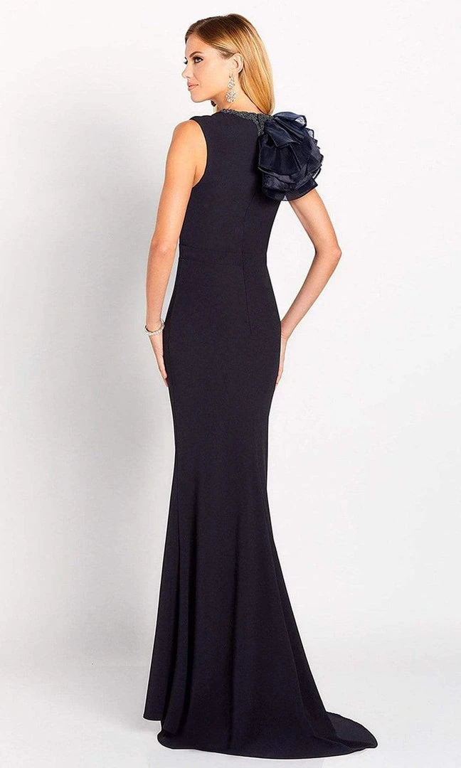 Have a blast in this fashionable dress by Cameron Blake 119645. This glamorous organza and stretch crepe fit and flare gown features a beaded deep plunging V-neckline with an illusion panel, a ruffled statement accent on the entire right shoulder and the trumpet skirt finishes in a sweep train. This posh party gown by Cameron Blake puts you in the spotlight